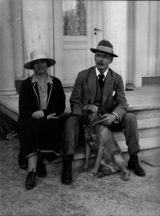 3 (of 4) Marie and Knut Hamsun, at Nørholm with their dog Dux, in around 1925.