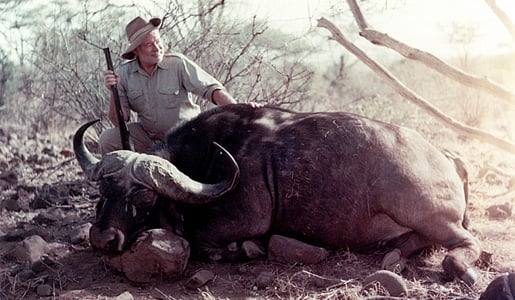 Ernest Hemingway poses with a water buffalo while on safari in Africa, 1953-1954.