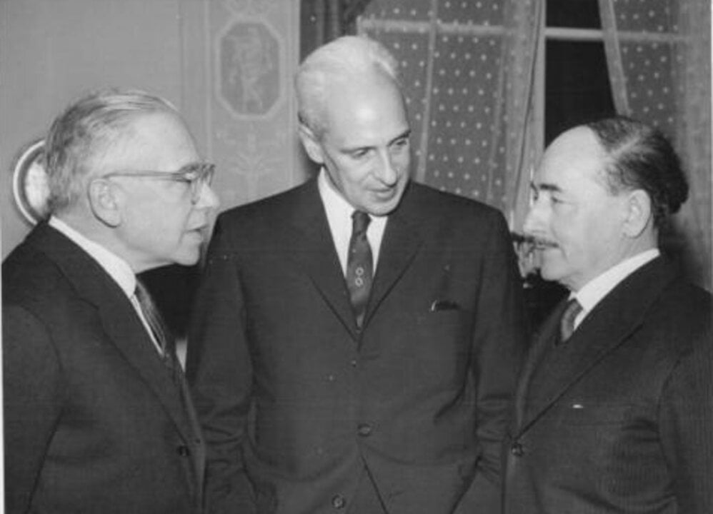 1 (of 1) From left: Physics laureate Emilio Segrè, medicine laureate Severo Ochoa and literature laureate Salvatore Quasimodo during Nobel Week in Stockholm, December 1959.