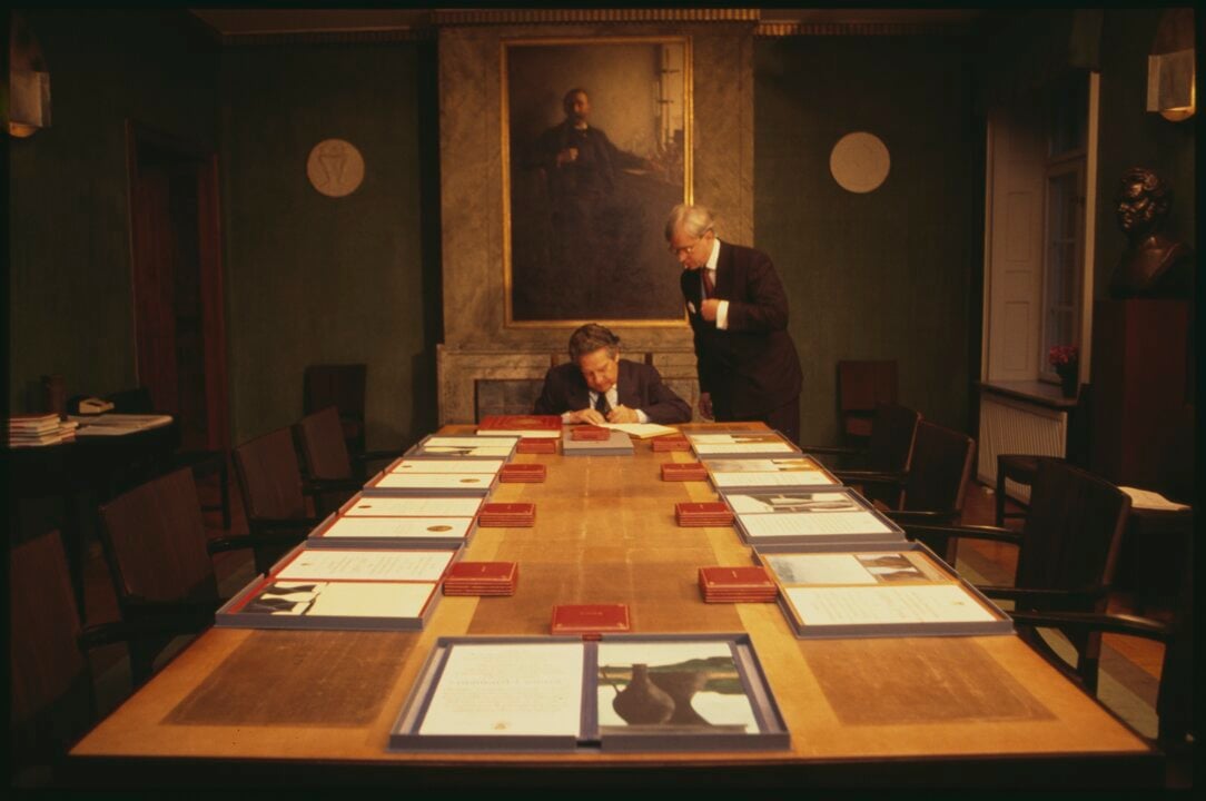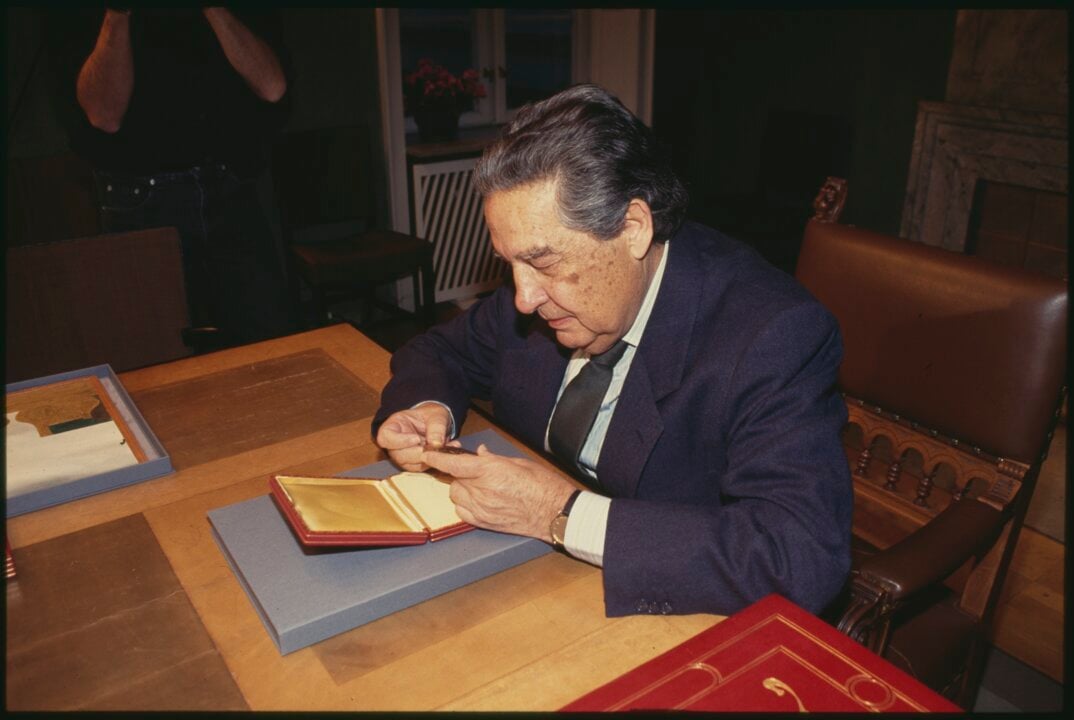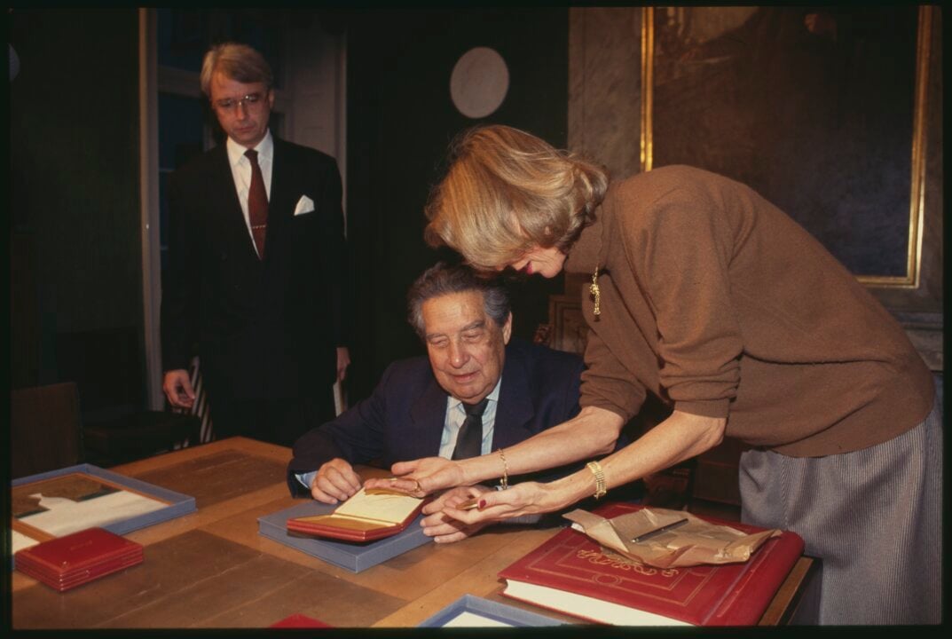 14 (of 17) Octavio Paz signs the Nobel Foundation's guest book, signed by the laureates since 1952, during his visit to the Nobel Foundation during Nobel Week in Stockholm, Sweden, December 1990.