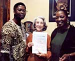 | Nadine Gordimer with Morakabe Seakhoa (left) receiving an award from an association of African women (in the 1990s). Nadine Gordimer’s private archive |