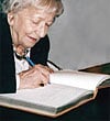 Wisława Szymborska, signing the guestbook, at the “International Conference on Wisława Szymborska’s Poetry,” Stockholm, May 23-24, 2003. See footnote.