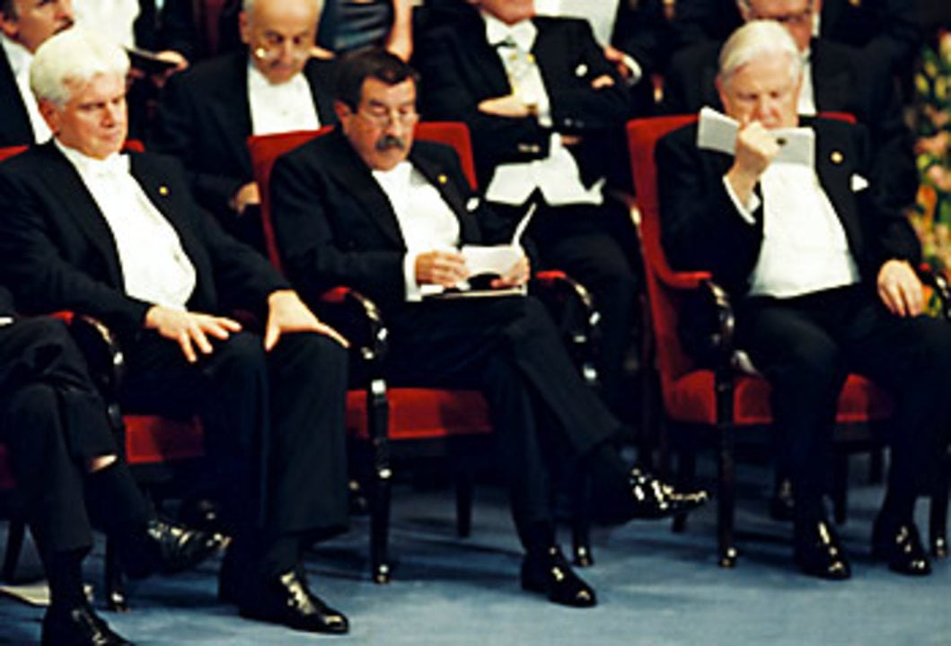 The Prize Award Ceremony at the Stockholm Concert Hall. From left Günter Blobel, Günter Grass and Robert Mundell.