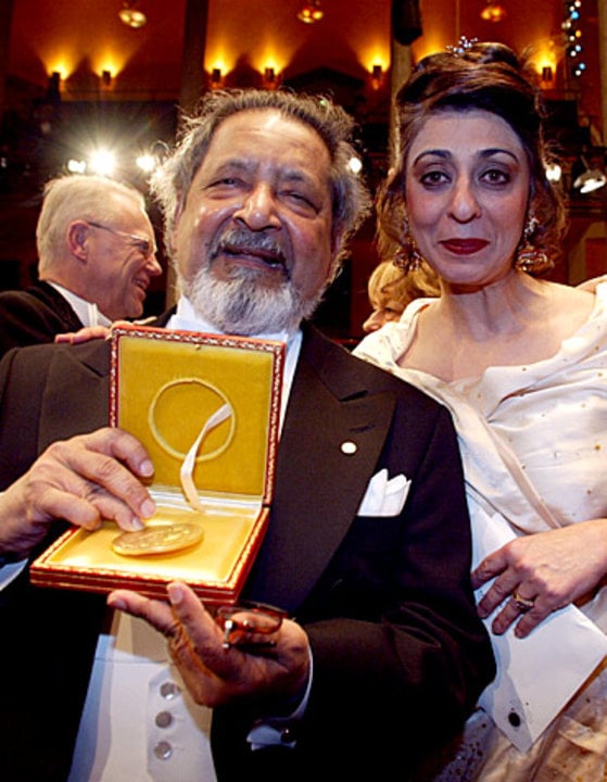 2001 Nobel Laureate in Literature, Sir V. S. Naipaul, displays his Nobel Prize Medal while Lady Naipaul beams with pride. Naipaul, who is a British citizen, was born in Trinidad.