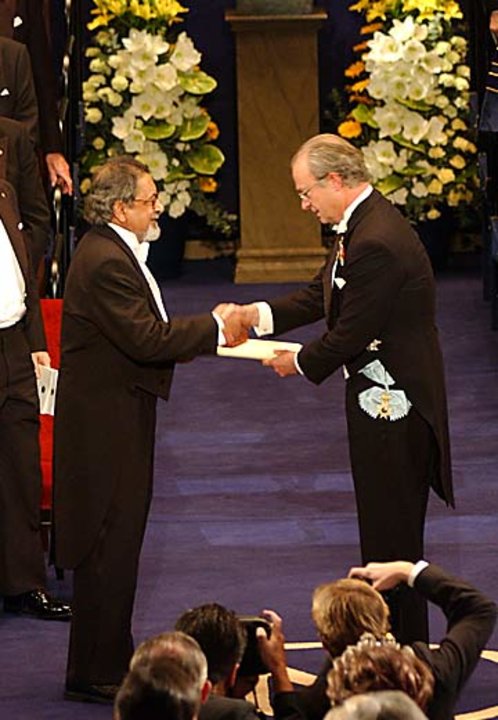 Sir V. S. Naipaul receiving his Nobel Prize from His Majesty King Carl XVI Gustaf of Sweden at the Stockholm Concert Hall, 10 December 2001.