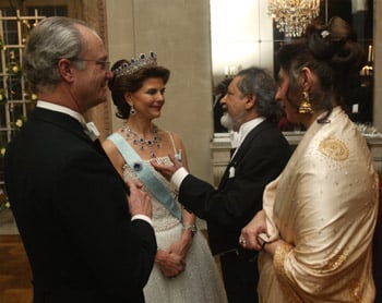 At the Prince's Gallery where the Royal Family held audience with the Nobel Laureates and other distinguished guests. From left: King Carl XVI Gustaf of Sweden, Queen Silvia, 2001 Nobel Laureate in Literature V. S. Naipaul and Lady Naipaul.