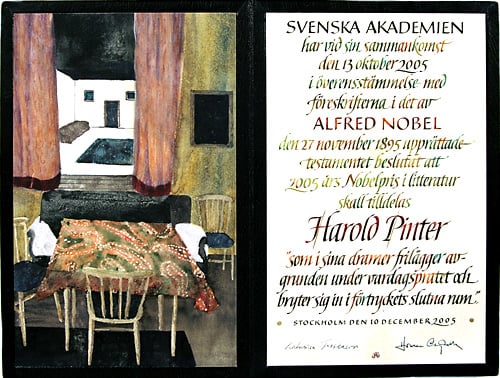 MLA style: Harold Pinter – Nobel diploma. NobelPrize.org. Nobel Prize Outreach 2025. Tue. 23 Dec 2025. <https://www.nobelprize.org/prizes/literature/2005/pinter/diploma/>