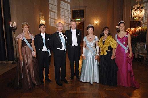 4 (of 13) From left to right: Princess Madeleine, Prince Carl Philip, His Majesty King Carl XVI Gustaf of Sweden, Jean-Marie Gustave Le Clézio, Her Majesty Queen Silvia, Mrs Jemia Le Clézio and Crown Princess Victoria at the Nobel Banquet on 10 December 2008.
