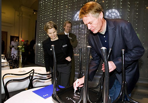 12 (of 13) Jean-Marie Gustave Le Clézio, like many Nobel Laureates before him, autographs a chair at Kafé Satir at the Nobel Museum in Stockholm, 6 December 2008.