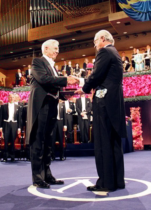 Mario Vargas Llosa receiving his Nobel Prize from His Majesty King Carl XVI Gustaf of Sweden at the Stockholm Concert Hall, 10 December 2010.