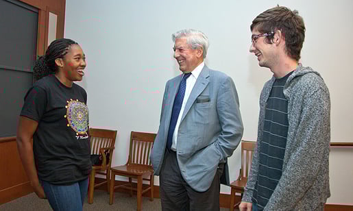 26 (of 36) Mario Vargas Llosa, talking to students after class, at Princeton University, (from left) juniors Chi Anunwa and Albert Fernandez. Photo taken in 2010.