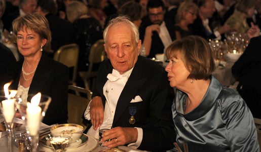Tomas Tranströmer and his wife Monica at the Nobel Banquet, 10 December 2011. To the left: Lena Liljeroth Adelsohn, Swedish Minister for Culture and Sports.