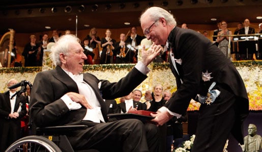 Tomas Tranströmer receiving his Nobel Medal and Diploma from His Majesty King Carl XVI Gustaf of Sweden at the Nobel Prize Award Ceremony, 10 December 2011.