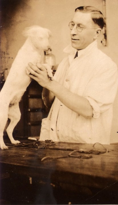 Student assistant Charles H. Best and Frederick G. Banting are standing on the roof of the medical building with one of the diabetic dogs used in their experiments with insulin.