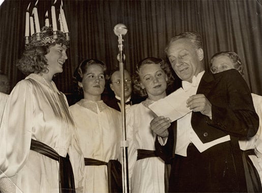 1 (of 1) Albert Szent-Györgyi at the Santa Lucia feast in Stockholm, Sweden, on 13 December 1937. Albert Szent-Györgyi stands with the queen of the Santa Lucia feast, possibly announcing her winning the contest.