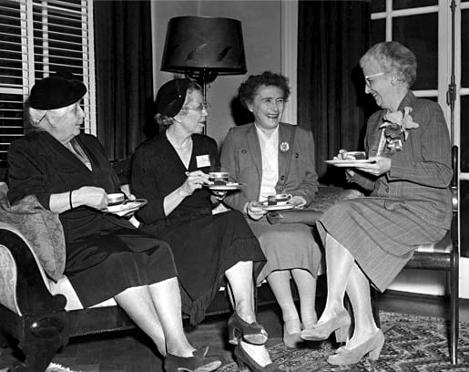 5 (of 5) A coffee break at the women's committee for the National Academy of Sciences meeting held in St. Louis in 1952. From left: Mrs. Shaffer, Mrs. Davis, Gerty Cori, and Helen T. Graham.