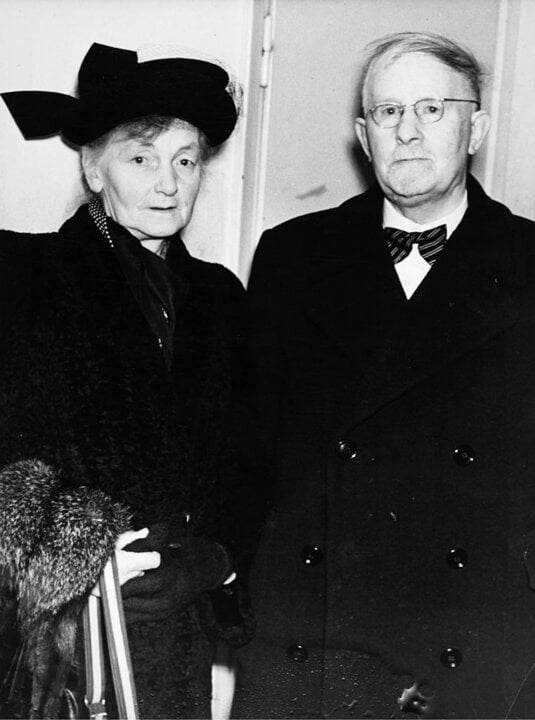 2 (of 2) Professor Walter Rudolf Hess with his wife arrives to Bromma Airport, Sweden, for the Nobel Week, 6 December 1949.