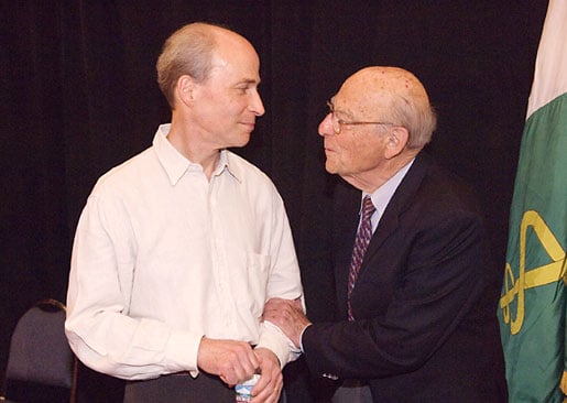 4 (of 7) Arthur Kornberg, right, after the press conference for his son, Roger Kornberg, who was awarded the 2006 Nobel Prize in Chemistry.