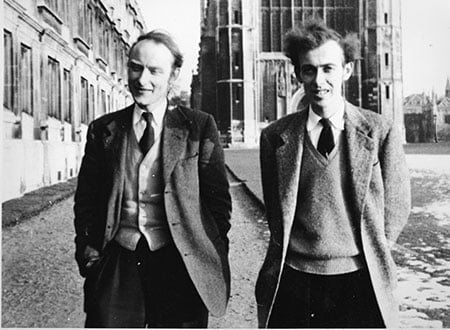 Francis Crick and James D. Watson walk along the Cambridge backs. Photo taken in 1953.