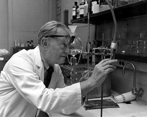 Julius Axelrod measuring chemicals in the lab (ca 1973).