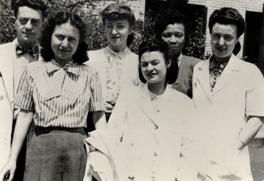 Members of the laboratory staff at Goldwater Memorial Hospital, Welfare [now Roosevelt] Island, New York City. On the back of the photograph is written, "Julius Axelrod, Betty Lang (later Mrs. E. Y. Berger), Shirley Udenfriend, Betty Roe, Evelyn Ford, Madeleine? (from Algeria)". Photo taken 1947 or 1948.
