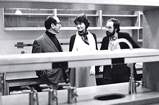 1 (of 1) David Baltimore (right) and Salvador Luria (left) with Nancy Hopkins (middle) at the Massachusetts Institute of Technology Cancer Center, 1973.