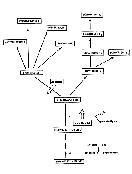 In contrast to the prostaglandins as well as thromboxanes and prostacyclin the leukotrienes do primarily not act as defense hormones. Furthermore, the leukotrienes are formed in only a few tissues and cells, i.e. in the lungs and white blood cells, where they evidently play an important role for the development of allergic and inflammatory manifestations. It has recently been shown that leukotrienes are formed and released in lung tissue obtained from asthmatic patients and exposed to allergy provoking agents. They induce contraction of the bronchi and cause an accumulation of liquid in the lung, thus eliciting changes which characteristic of the asthmatic attack. No doubt the discovery of the leukotrienes constitutes a breakthrough in the research on asthma. Compounds which block the formation of leukotrienes are also supposed to become effective anti-asthmatic drugs.