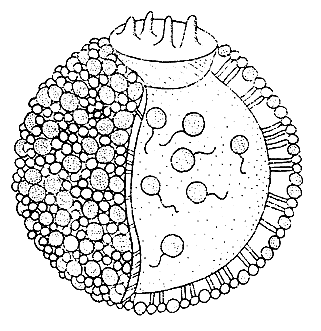 Figure 1. The LDL is a spherical particle with a radius of one millionth millimeter. Most of the cholesterol in the blood stream is found in LDL particles. Its core consists of approximately 1,500 cholesteryl esters, each a cholesterol molecule attached by an ester linkage to a long fatty acid chain. The core is surrounded by a surface coat composed of 800 molecules of phospholipid, 500 molecules of unesterified cholesterol and one large protein molecule, apoprotein B, which moors the LDL to the receptor on the cell surface.
