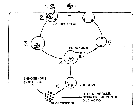Figure 2. The cells uptake of LDL particles circulating in the blood (1) starts with their mooring to LDL-receptors in coated pits (2) on the cell surface. These pits invaginate and pinch off to form coated vesicles (3). Fusion of vesicles gives rise to an endosome (4) in which the LDL dissociates from the receptor, which is recycled (5) to the surface. The LDL is delivered to a lysosome where the cholesteryl ester is cleaved to yield free cholesterol to be utilized for membrane synthesis or is converted to steroid hormones and bile acids. Cholesterol taken up by the cell inhibits the cell’s own cholesterol synthesis.