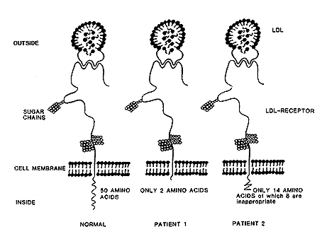 Brown and Goldstein have used modern molecular biology techniques to show that the LDL-receptor is a glycoprotein located in the cell membrane. Its protein part is constructed by 839 amino acids. Of these 767 are localized on the cell surface, 22 within the membrane and 50 inside the cell in the cytoplasma (Figure 3). The LDL-receptor defect can be one of several different kinds: in some cases the receptor is completely lacking, in others LDL binds poorly, or not at all, to receptor and in still others LDL is bound to the receptor but the LDL-receptor complex is not internalized. Analysis of the LDL-receptor in two patients have shown changes in the intracellularly located protein part of the glycoprotein: in one patient out of the expected number of 50 amino acids only two were present, in another 6 “correct” but 8 “wrong” amino acids were present. The part of the receptor located on the cell surface was unaltered in both patients.