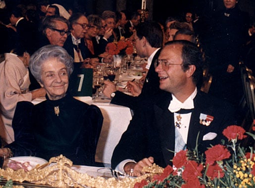 1 (of 8) Rita Levi-Montalcini and HM King Carl XVI Gustaf of Sweden enjoy a light moment at the Nobel Banquet in the Stockholm City Hall, Sweden, on 10 December 1986.