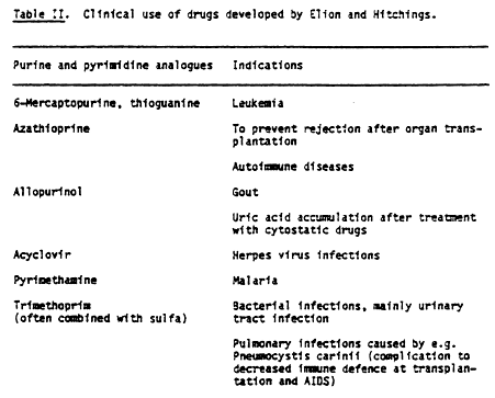 The clinical use of the drugs discovered by Elion and Hitchings is summarized in Table II.