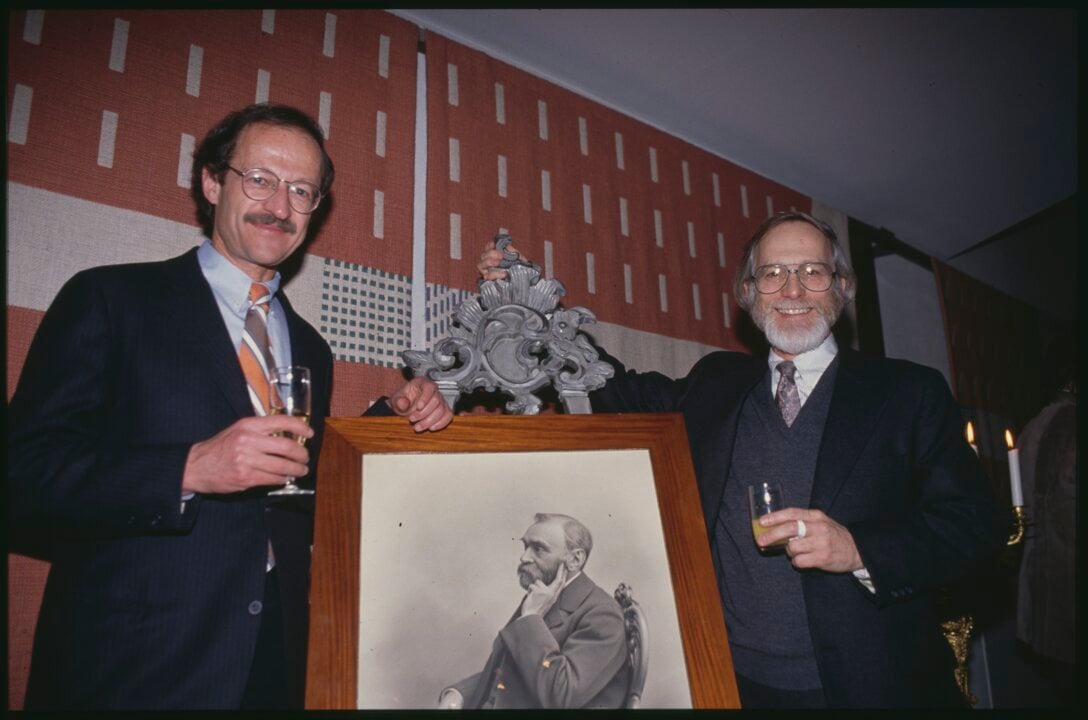 Medicine laureates J. Michael Bishop and Harold E. Varmus with a painting of Alfred Nobel. Photo taken during the Nobel Week, December 1989.