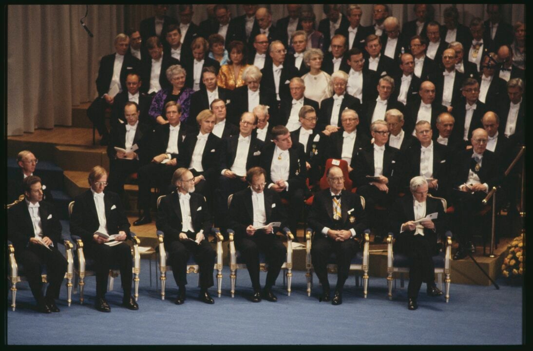 Laureates assembled at the Nobel Prize award ceremony in the Stockholm Concert Hall on 10 December 1989: Physics laureates Norman F. Ramsey, Hans G. Dehmelt and Wolfgang Paul, chemistry laureates Sidney Altman and Thomas R. Cech, medicine laureates J. Michael Bishop and Harold E. Varmus, literature laureate Camilo José Cela and economic sciences laureate Trygve Haavelmo.