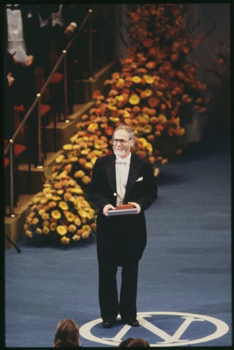 J. Michael Bishop after receiving his Nobel Prize from H.M. King Carl XVI Gustaf of Sweden at the Stockholm Concert Hall on 10 December 1989.