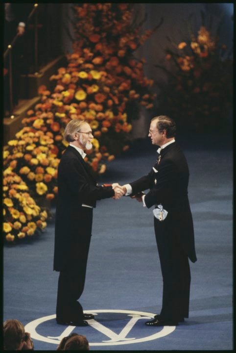J. Michael Bishop receiving his Nobel Prize from H.M. King Carl XVI Gustaf of Sweden at the Stockholm Concert Hall on 10 December 1989.