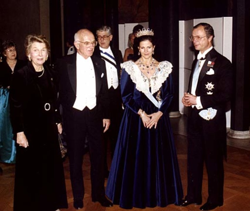 5 (of 7) Joseph E. Murray and his wife, Bobby, with Their Majesties King Carl XVI Gustaf (right) and Queen Silvia of Sweden (second from right) at the Nobel Banquet in the Stockholm City Hall, Sweden, on 10 December 1990.