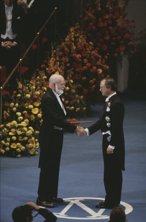 2 (of 5) All 1990 Nobel Prize laureates assembled on stage at the Nobel Prize award ceremony in Stockholm, Sweden on 10 December 1990: physics laureates Jerome I. Friedman, Henry W. Kendall and Richard E. Taylor, Chemistry laureate Elias James Corey, medicine laureates Joseph E. Murray and E. Donnall Thomas, literature laureate Octavio Paz and economic sciences laureates Harry M. Markowitz, Merton H. Miller and William F. Sharpe.