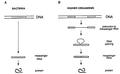 Figure 1: Gene structure and the flow of genetic information in bacteria (A) and higher organisms (B). In bacteria, the genetic information is stored as a continuous segment of DNA, and the messenger RNA can immediately direct the synthesis of the corresponding protein. In higher organisms, the gene is usually split, and the messenger RNA has to be processed by splicing before it can be translated into a protein.
