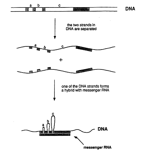 Figure 2: Schematic representation of the experiment that demonstrated that adenovirus DNA contains split genes. The genetic information in the messenger RNA resides in the DNA as four segments, which are separated by three intervening regions (a, b, and c). In the experimentally produced hybrid between one of the DNA strands and the RNA, the intervening sequences in the DNA strand appear as loops, i.e. the corresponding segments lack counterparts in the RNA. The hybrid could be directly visualized in the electron microscope.