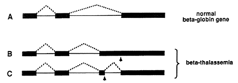 Figure 3: Defective splicing causing beta-thalassemia. A normal beta-globin gene is presented in A, and two mutated genes that result in beta-thalassemia are shown in B and C. Arrows mark the position of point mutations. The interrupted lines denote the segments that are being joined during the splicing process. In the healthy individual, three segments are spliced as shown in A. In one of the thalassemia cases, an unusually long third segment is formed (B), while in the second one, an extra segment is produced (C).