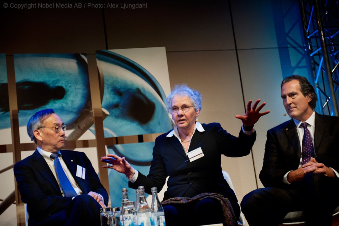 17 (of 17) Physics laureate Steven Chu, medicine laureate Christiane Nüsslein-Volhard and medicine laureate Craig C. Mello discussing 'The Genetic Revolution and its Impact on Society' at Nobel Week Dialogue, December 2012.