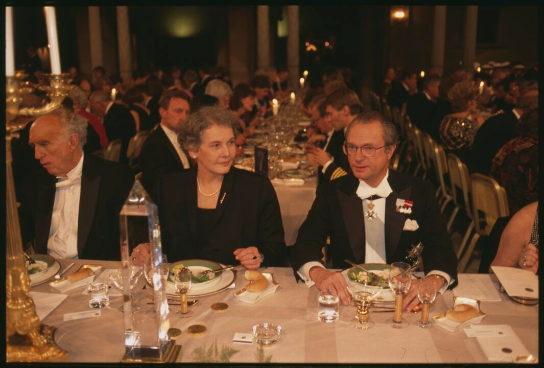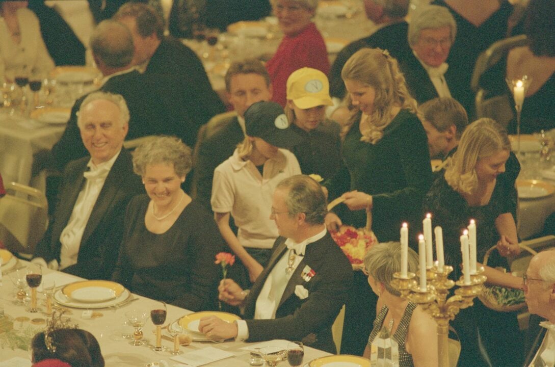 8 (of 17) From left: Sweden's Crown Princess Victoria, physics laureate Martin L. Perl, medicine laureate Christiane Nüsslein-Volhard and H.M. King Carl XVI Gustaf of Sweden at the Nobel Prize banquet in the Stockholm City Hall, 10 December 1995.