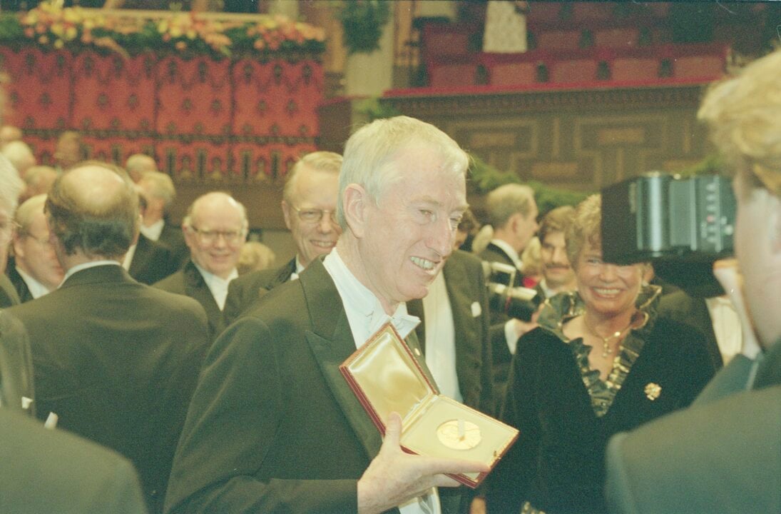 2 (of 12) All laureates assembled at the Nobel Prize award ceremony in the Stockholm Concert Hall on 10 December 1996. From left: physics laureates David M. Lee, Douglas D. Osheroff and Robert C. Richardson, chemistry laureates Robert F. Curl Jr., Sir Harold W. Kroto and Richard E. Smalley, medicine laureates Peter C. Doherty and Rolf M. Zinkernagel, literature laureate Wislawa Szymborska and economic sciences laureate James A. Mirrlees.