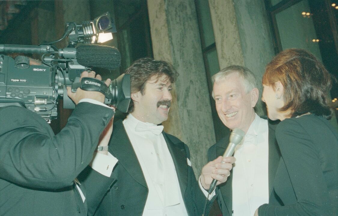 5 (of 12) Peter C. Doherty being interviewed outside the Concert Hall in Stockholm, Sweden on 10 December 1996.