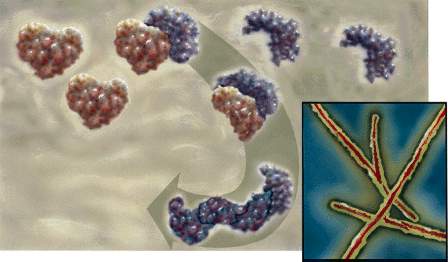 The prion protein exists in two forms. The normal, innocuous protein (PrPc) can change its shape to a harmful, disease-causing form (PrPSc). The conversion from PrPc to PrPSc then proceeds via a chain-reaction. When enough PrPSc proteins have been made they form long filamentous aggregates that gradually damage neuronal tissue. The harmful PrPSc form is very resistant to high temperatures, UV-irradiation and strong degradative enzymes.