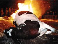 2. In inherited forms, mutations in the prion gene are transmitted from parent to child. 3. They can arise spontaneously. Route of infection When cows are fed with offals prepared from infected sheep, prions are taken up from the gut and transported along nerve fibers to the brain stem. Here prions accumulate and convert normal prion proteins to the disease-causing form, PrPSc. Years later, BSE results when a sufficient number of nerve cells have become damaged, affecting the behaviour of the cows. |
