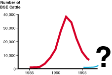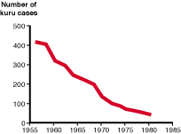 The kuru epidemic started a long time ago and has subsided since the 1950s. The mad cow disease epidemic started in 1985 affecting approximately 170,000 cows.
