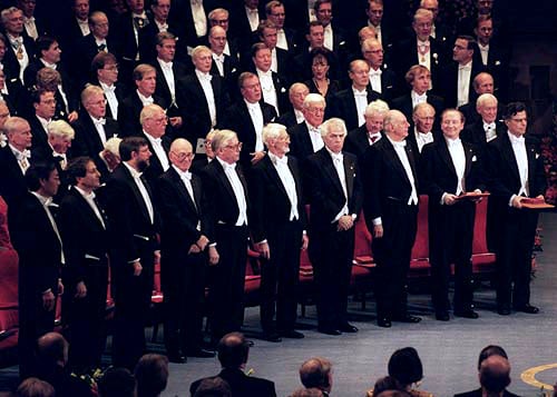 11 (of 12) 1997 Nobel Prize laureates assembled at the Swedish Academy in Stockholm during Nobel Week, December 10997. From left: Jens C. Skou, Stanley B. Prusiner, Steven Chu, Robert C. Merton and Myron S. Scholes.