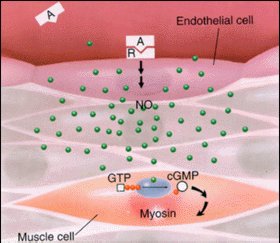 Ferid Murad knew that nitroglycerine caused relaxation of smooth muscle cells. The enzyme, guanylyl cyclase, was activated and increased cyclic GMP, causing relaxation of the muscle. Did nitroglycerin act via release of nitric oxide, NO? He bubbled NO-gas through tissue containing the enzyme; cyclic GMP increased! A new mode of drug action had been discovered!